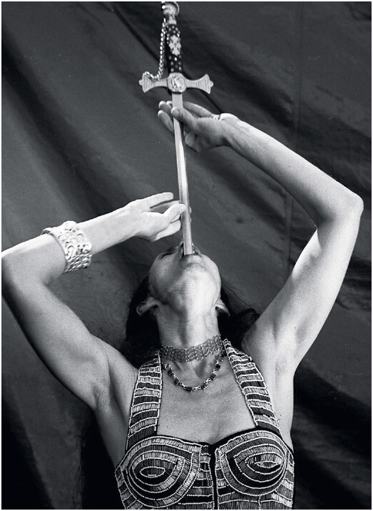 我刚开始学习表演的时候,一块冰冷钢条穿过食道的感觉真是前所未有的奇怪。现在一切已经很自然了。我可以连着吞十把剑。我压着舌头,把它们在喉咙里垒起来。我试着去平息那种条件反射似的呕吐感。当喉咙越紧,情况就越难控制。如果我吞剑的数目多于七把,那么我的眼睛就会流泪。当我吞剑的数目较多时,我的食道会肿胀起来,变得比较靠近心脏,我甚至可以感受到我的心跳。如果我稍微扭动剑柄,喉咙就会有一种又干又冷的感觉。还有一次我因为表演得太多,把喉咙磨破皮了。
