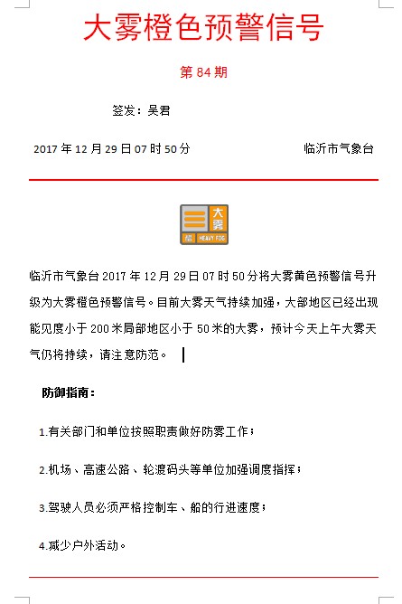 临沂市气象台2017年12月29日07时50分将大雾黄色预警信号升级为大雾橙色预警信号。