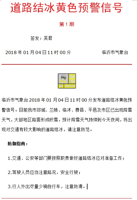 临沂市气象台2018年01月04日11时00分发布道路结冰黄色预警信号